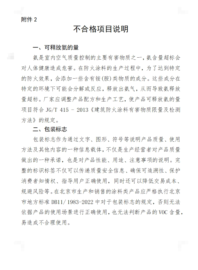 按照《中華人民共和國產(chǎn)品質量法》《產(chǎn)品質量監(jiān)督抽查管理暫行辦法》等法律、規(guī)章,以及本市產(chǎn)品質量監(jiān)督抽查計劃和實施細則,北京市市場監(jiān)督管理局堅持問題導向,將近年抽查不合格率較高的檢測項目納入實施細則,聚焦易出問題的經(jīng)營場所和品牌,組織開展了防火涂料產(chǎn)品質量監(jiān)督抽查。共抽樣檢驗2組批樣品,檢出2組批包裝標志、可釋放氨的量不符合標準。