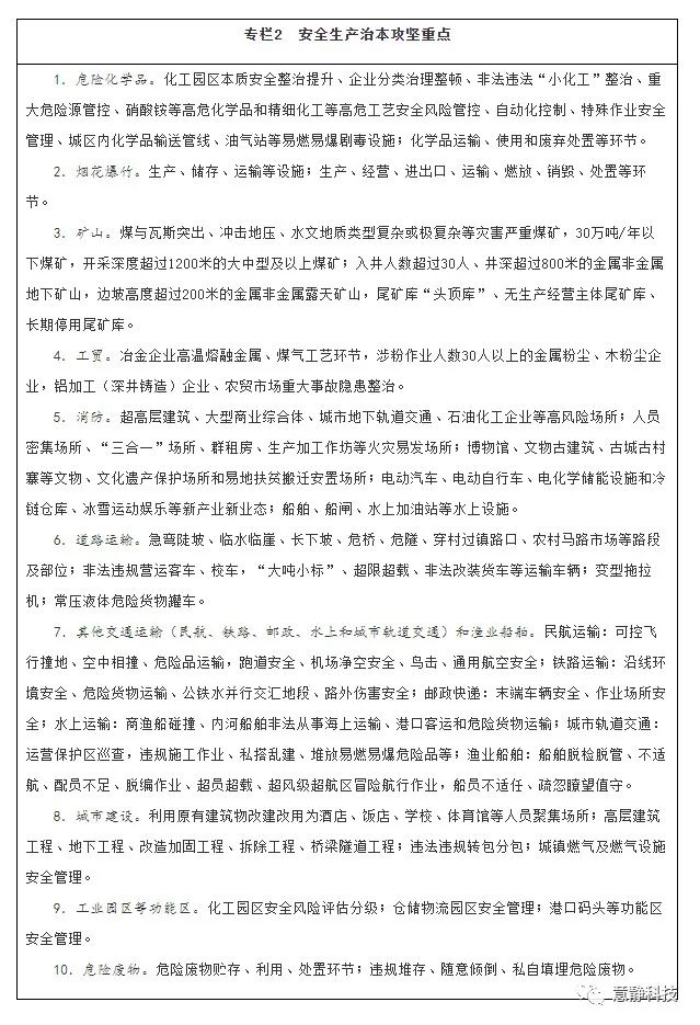 深化專項整治。深入推進(jìn)危險化學(xué)品、礦山、消防、交通運輸、建筑施工、民爆、特種設(shè)備、大型商業(yè)綜合體等重點行業(yè)領(lǐng)域安全整治,解決影響制約安全生產(chǎn)的薄弱環(huán)節(jié)和突出問題,督促企業(yè)嚴(yán)格安全管理、加大安全投入、落實風(fēng)險管控措施。結(jié)合深化供給側(cè)結(jié)構(gòu)性改革,推動安全基礎(chǔ)薄弱、安全保障能力低下且整改后仍不達(dá)標(biāo)的企業(yè)退出市場。統(tǒng)籌考慮危險化學(xué)品企業(yè)搬遷和項目建設(shè)審批,優(yōu)先保障符合條件企業(yè)的搬遷用地。持續(xù)推進(jìn)企業(yè)安全生產(chǎn)標(biāo)準(zhǔn)化建設(shè),實現(xiàn)安全管理、操作行為、設(shè)施設(shè)備和作業(yè)環(huán)境規(guī)范化。推動淘汰落后技術(shù)、工藝、材料和設(shè)備,加大重點設(shè)施設(shè)備、儀器儀表檢驗檢測力度。推動各類金融機(jī)構(gòu)出臺優(yōu)惠貸款等金融類產(chǎn)品,大力推廣新技術(shù)、新工藝、新材料和新裝備,實施智能化礦山、智能化工廠、數(shù)字化車間改造,開展智能化作業(yè)和危險崗位機(jī)器人替代示范。強(qiáng)化危險廢物全過程監(jiān)管,動態(tài)修訂《國家危險廢物名錄》,修訂危險廢物鑒別、貯存以及水泥窯協(xié)同處置污染控制等標(biāo)準(zhǔn),制定完善危險廢物重點監(jiān)管單位清單。建立廢棄危險化學(xué)品等危險廢物監(jiān)管協(xié)作和聯(lián)合執(zhí)法工作機(jī)制,加強(qiáng)危險廢物監(jiān)管能力與應(yīng)急處置技術(shù)支持能力建設(shè)。