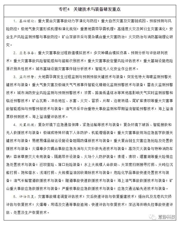 深化應(yīng)用基礎(chǔ)研究。聚焦災(zāi)害事故防控基礎(chǔ)問題,強(qiáng)化多學(xué)科交叉理論研究。開展重大自然災(zāi)害科學(xué)考察與調(diào)查。整合利用中央和地方政府、企業(yè)以及其他優(yōu)勢科技資源,加強(qiáng)自主創(chuàng)新和“卡脖子”技術(shù)攻關(guān)。實施重大災(zāi)害事故防治、重大基礎(chǔ)設(shè)施防災(zāi)風(fēng)險評估等國家科技計劃項目,制定國家重大應(yīng)急關(guān)鍵技術(shù)攻關(guān)指南,加快主動預(yù)防型安全技術(shù)研究。