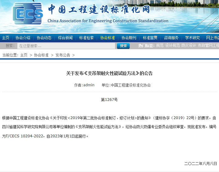 根據(jù)中國工程建設標準化協(xié)會《關于印發(fā)<2019年第二批協(xié)會標準制訂、修訂計劃>的通知》(建標協(xié)字〔2019〕22號)的要求,由四川省建筑科學研究院有限公司等單位編制的《支吊架耐火性能試驗方法》,經協(xié)會防火防爆專業(yè)委員會組織審查,現(xiàn)批準發(fā)布,編號為T/CECS 10204-2022,自2023年1月1日起施行。