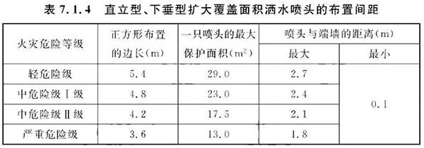 7.1.4直立型、下垂型擴(kuò)大覆蓋面積灑水噴頭應(yīng)采用正方形布置,其布置間距不應(yīng)大于表7.1.4的規(guī)定,且不應(yīng)小于2.4m。