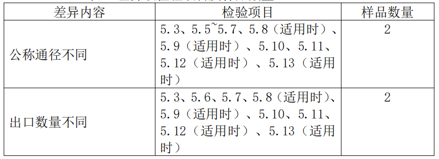 認(rèn)證委托人在單元內(nèi)選取公稱通徑最大的型號(hào)作為典型產(chǎn)品型號(hào)進(jìn)行 5.2.3、5.3、5.5~5.7、5.8(適用時(shí))、5.9(適用時(shí))、5.10、5.11、5.12 (適用時(shí))、5.13(適用時(shí))、5.14 項(xiàng)目的檢驗(yàn),其他型號(hào)按照表 1 規(guī)定 進(jìn)行差異項(xiàng)檢驗(yàn)。