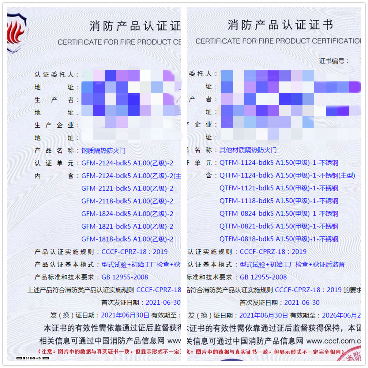 祝賀我司福建地區(qū)客戶申請(qǐng)的(鋼質(zhì)隔熱防火門、其他材質(zhì)隔熱防火門)已于2021年6月30號(hào)獲證,同祝企業(yè)生意興隆,財(cái)源滾滾。